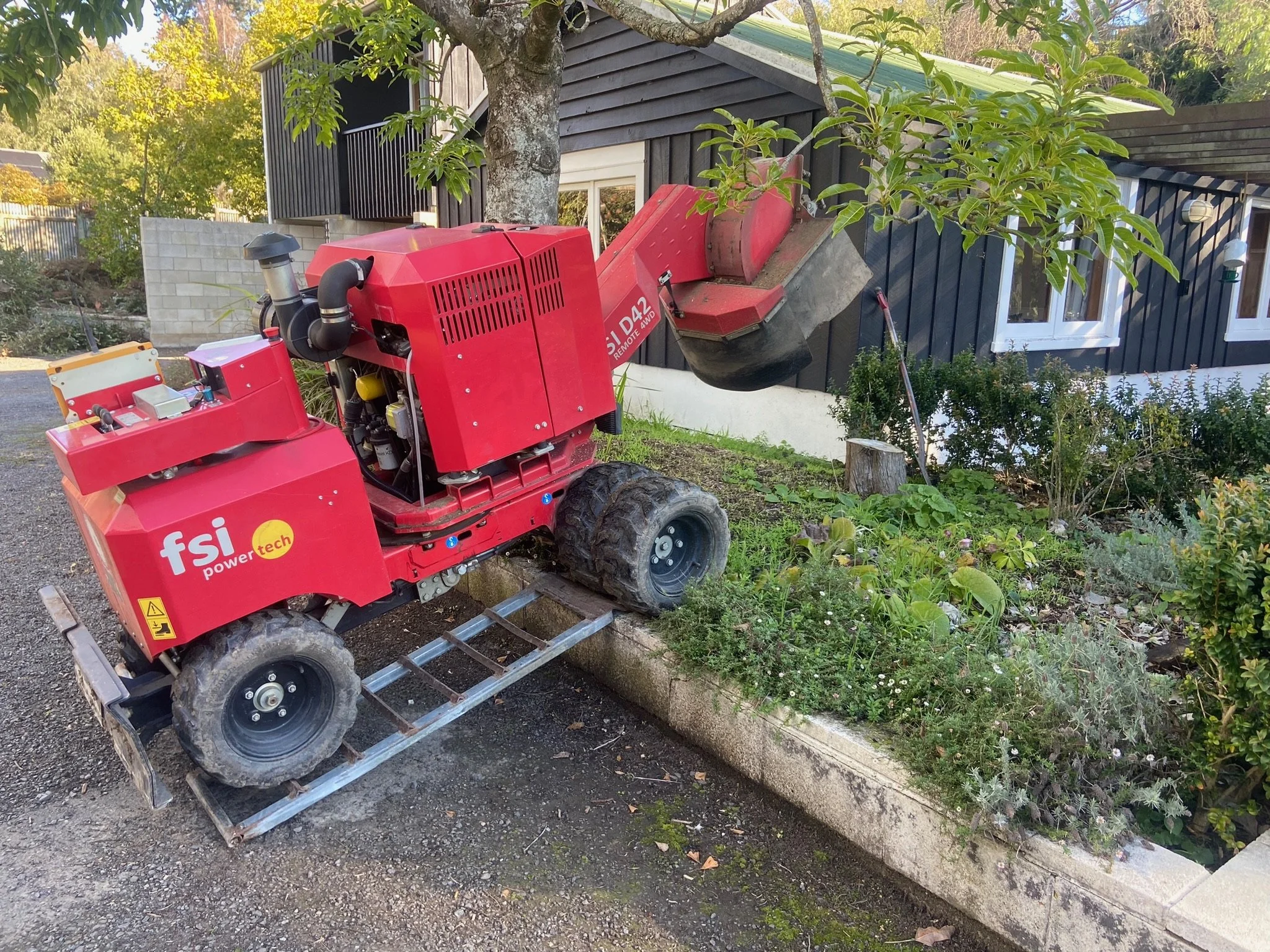 • A red remote-controlled mini digger with the brand names FSI Power Tech and SLI DA2 is working near a garden bed, lifting soil or plants with its small bucket in front of a black house with white window frames.