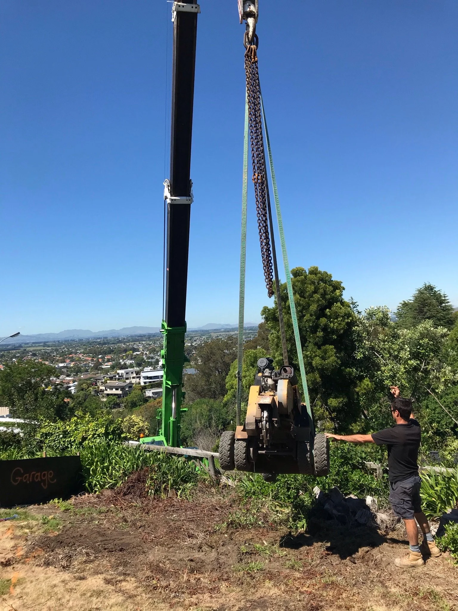 • Worker operating a small tracked excavator or mini digger outdoors, wearing a yellow safety vest and using the machine to dig in a grassy area near a fenced yard.